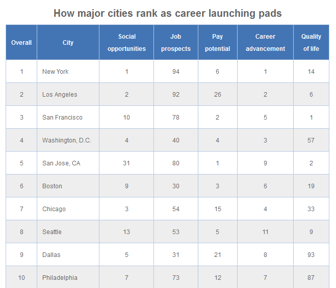 While New York has the 18th highest unemployment rate and the 12th highest for graduates, the city came in first place for the best place to launch your career. As the city of bright lights and nonstop hustle, New York landed the No. 1 spot for career advancement, proving that if you’re able to weather the storm of New York’s tough living and high prices, you will eventually reap the rewards. Also, with a highly educated population and a high percentage of 20-somethings, the city ranked No. 1 for social opportunities.