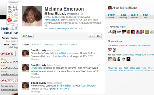 Author of Become Your Own Boss in 12 Months and speaker at this year’s Black Enterprise’s Entrepreneurs Conference, Melinda Emerson, donned the “SmallBizLady,†is dedicated to making sure entrepreneurs are aware of everything there is to know about launching successfully and managing a profitable small business. The seasoned entrepreneur is a strong resource on the social media platform, engaging in daily dialogue with her 28,284 followers–either by responding directly to her mentions or through her weekly Twitter talk show, #Smallbizchat (Wed., 8-9 p.m. ET).
