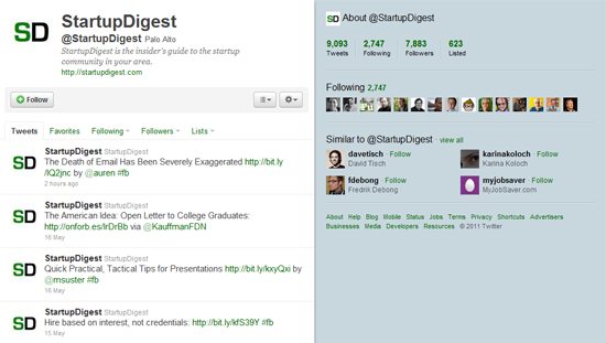 The major social and digital media source provides a perfect balance of technology and business news geared towards those already on the cutting edge of these constantly changing fields. Named an Ad Age 2011 influencer and one of Time magazine’s 100 in 2010, Cashmere–CEO of Mashable–powers the account constantly tweeting the site’s latest stories. Entrepreneurs can expect to see a great deal tweeted from Mashable’s startup channel.