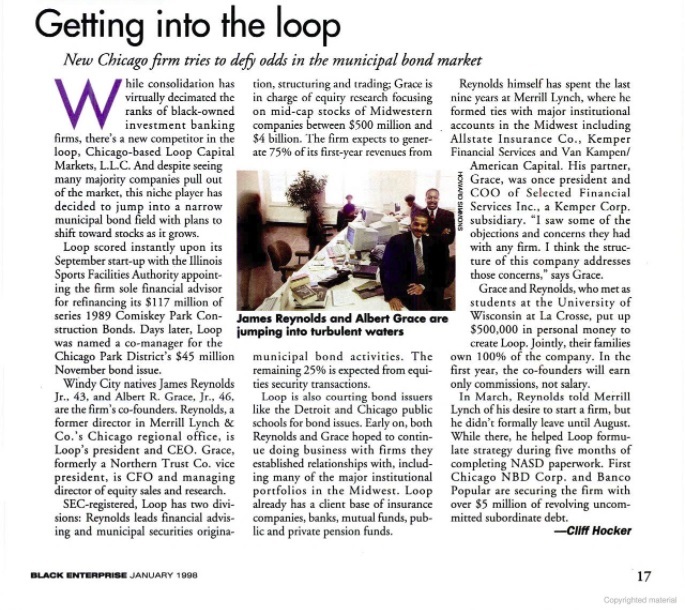 Gaining more than 25 top-notch professionals from downsized bond and global equity units of massive Wall Street operations positioned rock-solid, toxic-free Loop Capital to pursue big game. It was Reynolds’ emphasis on financial stability and operational consistency when he co-founded the firm in 1987 that enabled it to pounce on a number of transactions designed to stabilize iconic, but battered, institutions such as AIG, Citigroup, and General Motors, which the federal government forced into bankruptcy in 2009, In our profile of Loop Capital when the firm was named the 2016 BLACK ENTERPRISE Financial Company of the Year, Sidney Dilliard, a partner and head of the corporate investment banking division, said of the firm’s ability to make such moves: “Due to the fact that we reinvested in our firm, Loop had the capital [that] allowed us to participate.”