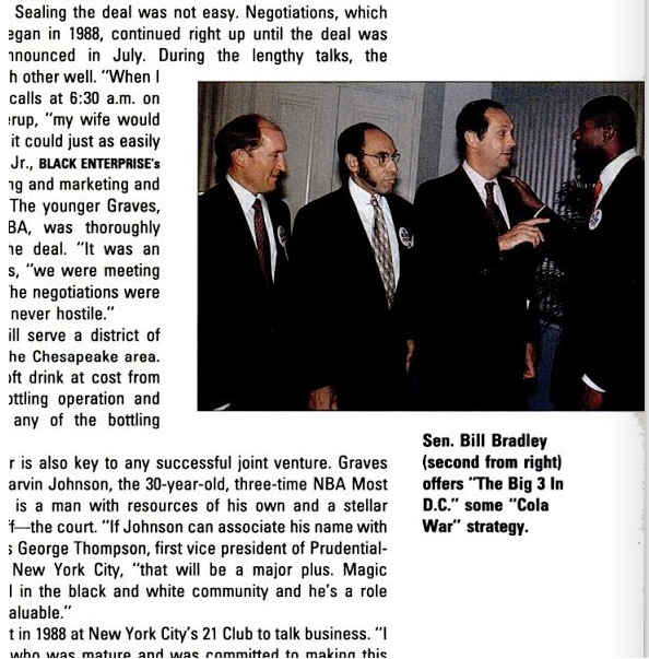 In a move exemplifying the growth of African American business at the time, Graves and Earvin “Magic” Johnson, the Los Angeles Lakers veteran, officially entered the $40 billion soft drink business by teaming up to purchase Pepsi-Cola of Washington D.C., a Forestville, Maryland sales distribution facility serving the District of Columbia and a small area of Prince Georges County, Maryland. The $60 million deal marked only the second time in 20 years that Pepsi had brought new ownership to its franchise network. At the time, the only other black-owned Pepsi franchise was a Houghton, Michigan-based enterprise owned by Dr. William Harvey, president of Hampton University.