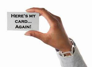 Seated at lunch, waiting for the program to begin, I noticed a woman sprinting from table to table, giving out cards. I thought she was snagging the chance to distribute marketing materials for her business to as many people as she could–a brilliant move if it had been the case. Or, maybe she was handing out invitations or exclusive coupons for her services. It was none of the above. This woman, who made her way to my table soon enough, was literally giving her business card to every person in the room, barely lingering long enough to say her own name, no less learn anyone else’s. Was she an environmentalist who ordered too many cards and didn’t want them wasted? Did she make a bet to see how many cards she could give out in record time? Was she multi-tasking by getting her name out while doing a sort of workout? I couldn’t imagine. When she walked away from us, my table mates and I sat there, dumbfounded, each staring at her card, which had an ironic motto printed in bold at the bottom: “Connecting with a Purpose.†Really?