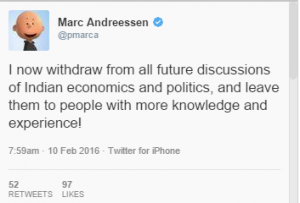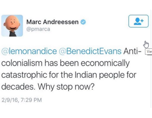 Adding to the level of uneasiness regarding white males deciding what masses of brown and black people may or may not view on the Internet is a Tweet from venture capitalist Marc Andresseen: