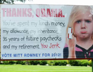 One billboard ad depicts a young white girl pouting, while holding her middle finger up with the message, “Thanks, Obama. You spent my lunch money, my allowance, my inheritance, 35 years of future paychecks and my retirement, you jerk.” While the ad clearly points to criticisms of what Republicans characterize as President Barack Obama‘s fiscal recklessness, the pointing of the girl’s finger has become true center of controversy.