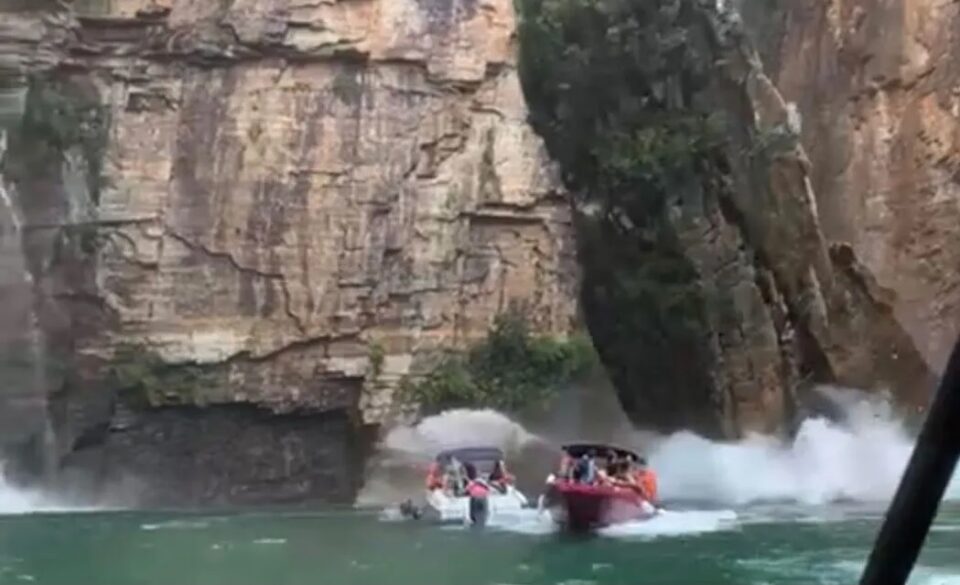 In the video, several boats can be seen at various distances from the wall as a large mass breaks off the coast and falls into Furnas Lake in the state of Minas Gerais. The rock fell directly onto two boats and caused a massive wave to impact the others.