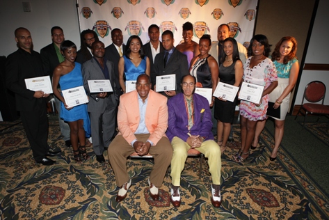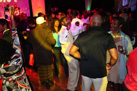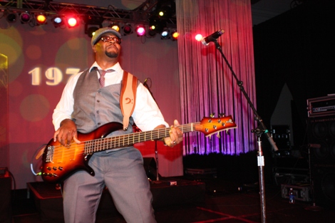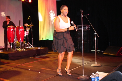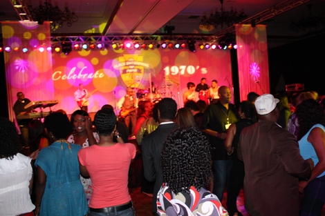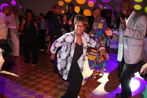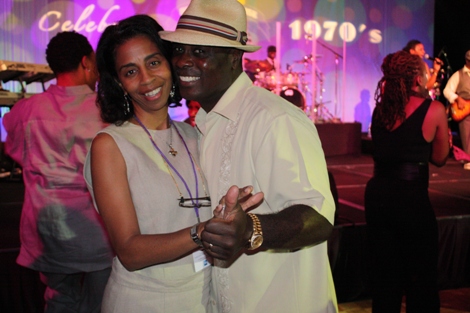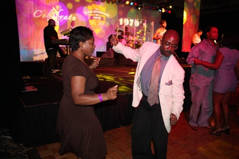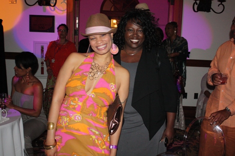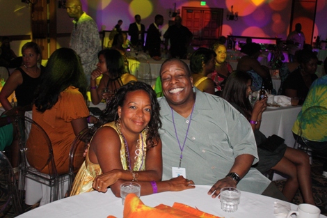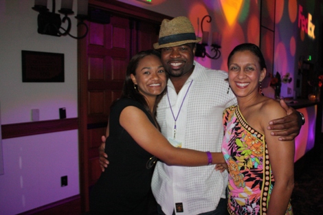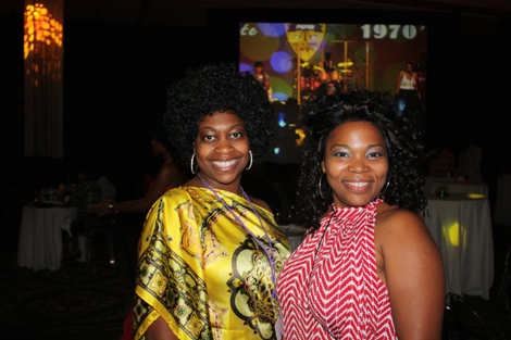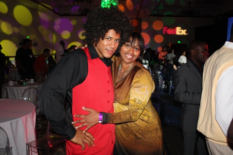"The Mack" (played by Our World with Black Enterprise producer and Black Enterprise Business Report correspondent Shannon Lanier) gets a hug from Black Enterprise VP/Director of Broadcast Genevieve Michel Bryan at the welcome reception of the 17th Annual Black Enterprise/Pepsi Golf & Tennis Challenge, which kicked off at La Costa Resort and Spa in Carlsbad, Calif. on Sept. 2, 2010. To celebrate the first decade of Black Enterprise, attendees of the reception, hosted by FedEx, took it back to the 1970s, with the theme "Love, Peace & Soooooul!" (Photo by LaToya M. Smith)