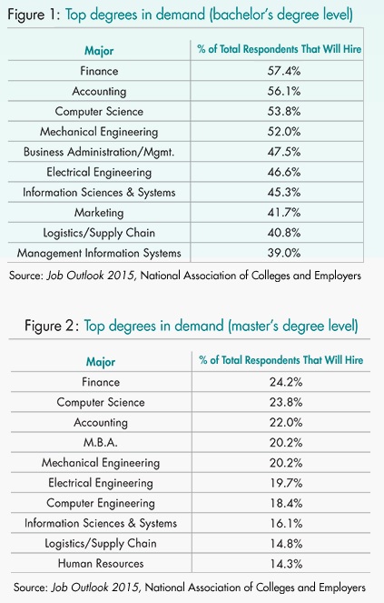 According to the National Association of Colleges and Employers (NACE), finance, accounting and computer science are the most in-demand majors at the bachelor’s and master’s degree level for 2015. Collecting data from August 2014 through October 2014, the survey found that more than 57.4% of employers hiring graduates with bachelor’s degrees intend to hire finance majors. While the demand is still high for young professionals holding STEM-related degrees, with engineering majors making NACE’s Top 10 list, the Graduate Management Admissions Council reports that more companies are looking to hire MBA graduates in 2015 than they have in any single year since 2003.