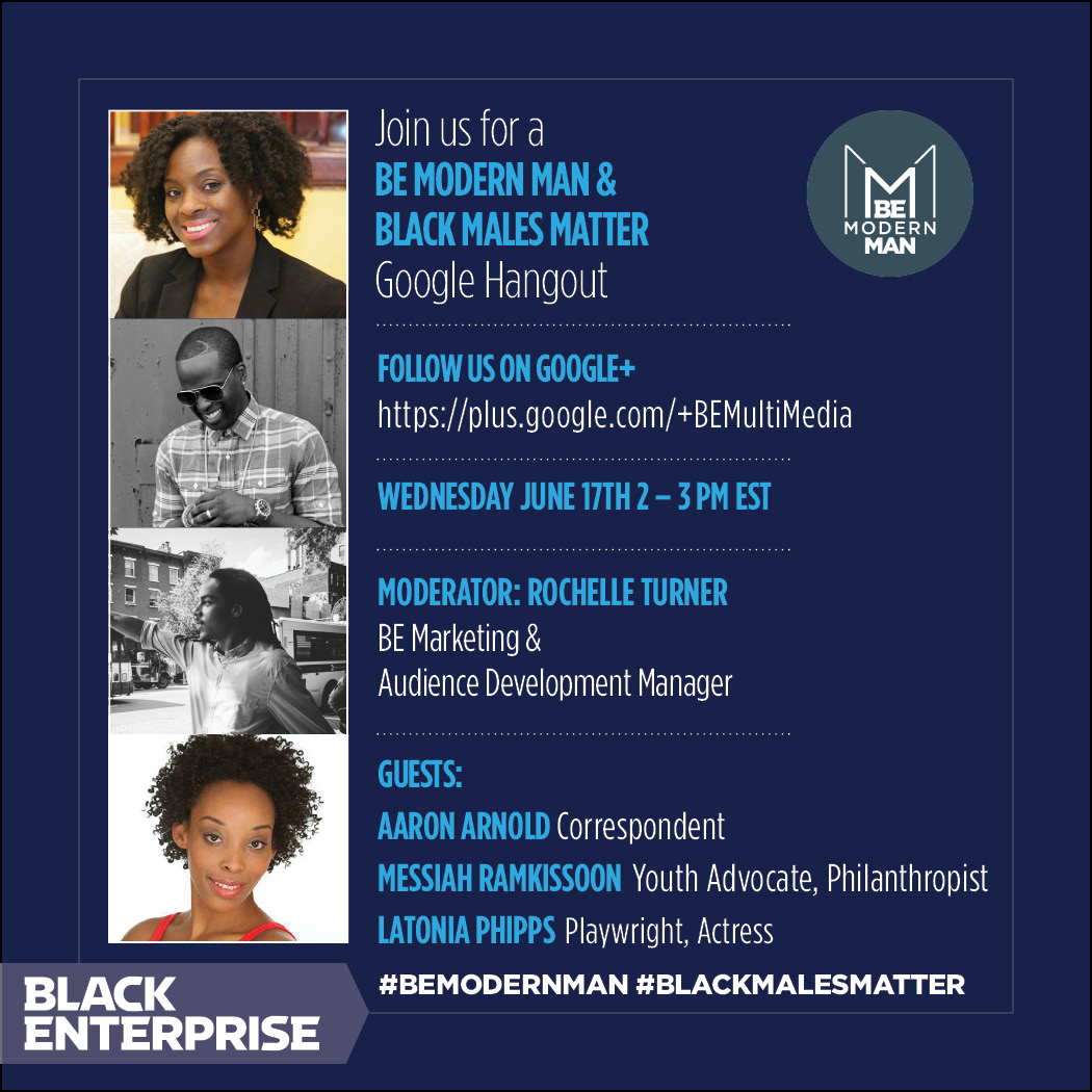 As a continuation of our Black Males Matter town hall discussion, Black Enterprise and BE Modern Man will host a Google Hangout this Wednesday, June 17th from 2-3 pm EST .