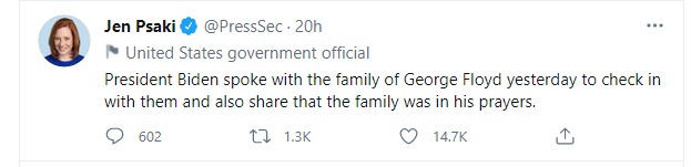 Vice President Kamala Harris joined the call. She thanked the Floyd family for their courage, commitment, and strength. She later continued this was a day of justice in America, and in Floyd’s name and memory, they would make sure Floyd’s legacy is intact. Harris further stated that with the family’s leadership and the president that they will make something good come out of the tragedy.