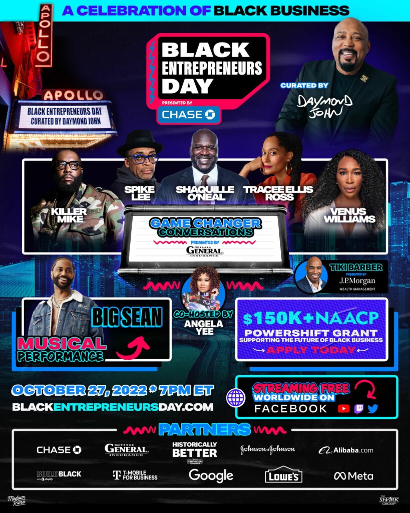 Since its inception, Black Entrepreneurs Day has provided guidance and inspiration to the next generation of rising entrepreneurs as well as over $500,000 in business grants via the “NAACP Powershift Entrepreneur Grant,” created by Daymond John. Black Entrepreneurs and small business owners across the country can apply now for a $25,000 NAACP Powershift Entrepreneur Grant on the event website through Oct. 12, 2022 at 11:59 p.m. ET.