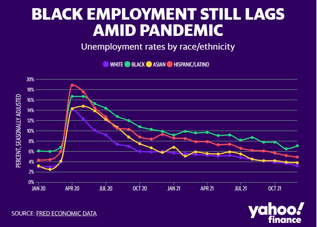 A chart created by Yahoo! Finance using FRED Economic Data shows that when the unemployment rate peaked in April 2020, Hispanics were the most impacted. From that point through January of last year, the rate of Black unemployment steadily declined from 16.7% to 9.2%.
