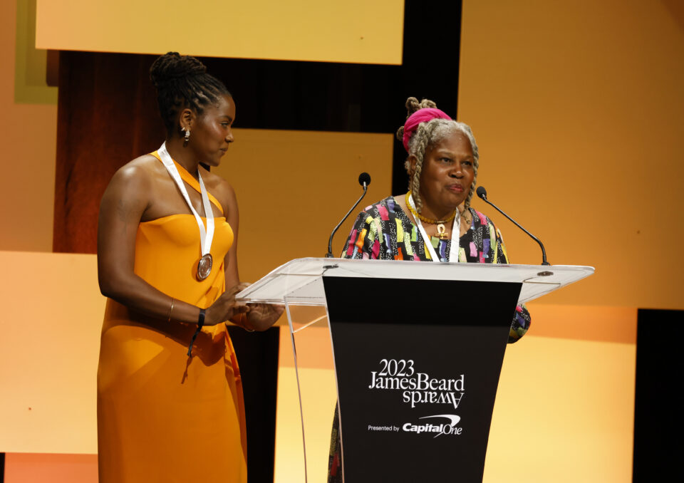 Karen Washington and Olivia Watkins, co-founders of Black Farmer Fund, win Humanitarian of the Year at the 2023 James Beard Restaurant And Chef Awards at Lyric Opera Of Chicago. (Photo: Jeff Schear/Getty Images for The James Beard Foundation)