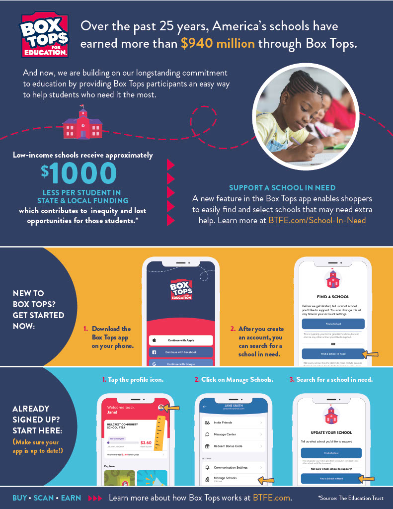 - As consumers shop for back-to-school season, a new Schools in Need search feature in the Box Tops app allows shoppers to find and select schools in need (where more than 40% of its student population is on the Free and Reduced Lunch Program) to receive funding from purchases of Box Tops products, with a goal of increasing Box Tops funds to schools in need by 20% by June of 2022. The “Schools In Need” app feature makes it easier for shoppers to find and support schools to help close the achievement gap, which disproportionately impacts children of color.