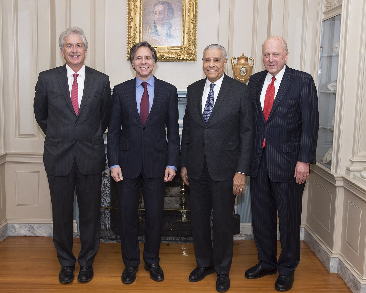Deputy Secretary of State Antony “Tony” Blinken poses for a photo with former Deputy Secretaries of State Bill Burns, Clifton Wharton, and John Negroponte at a Foreign Service Institute reception highlighting American diplomacy at the U.S. Department of State in Washington, D.C., on February 2, 2016. (Image: U.S. Department of State / Wikimedia Creative Commons)