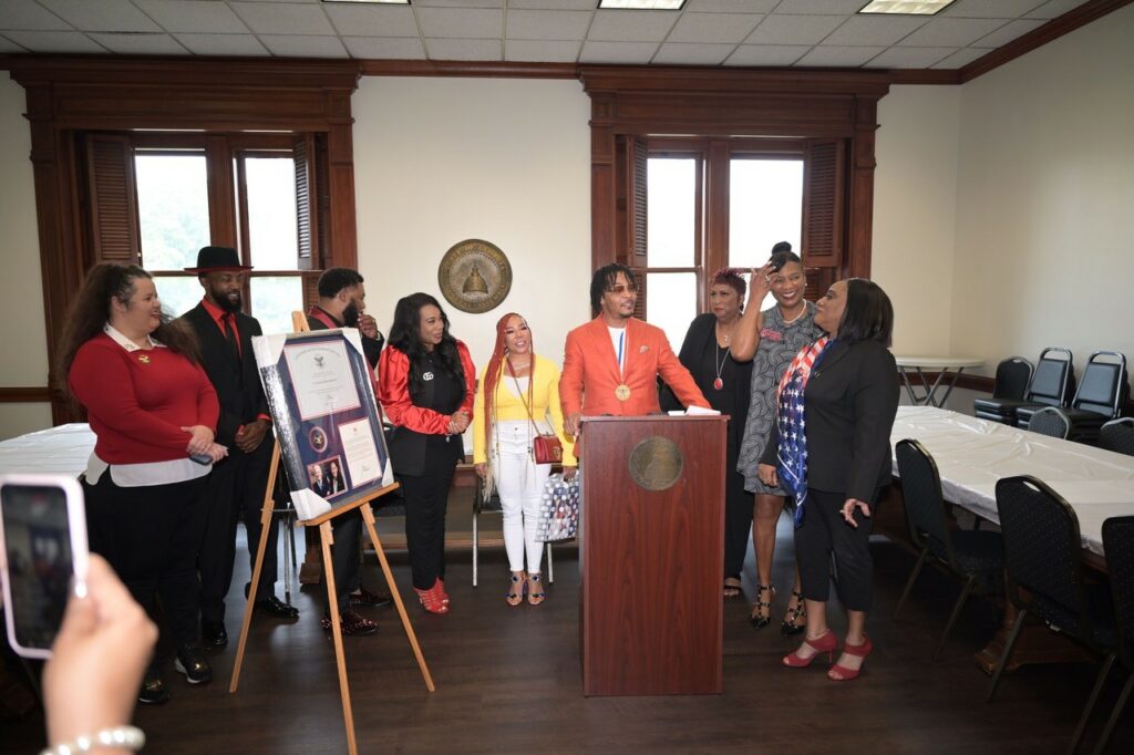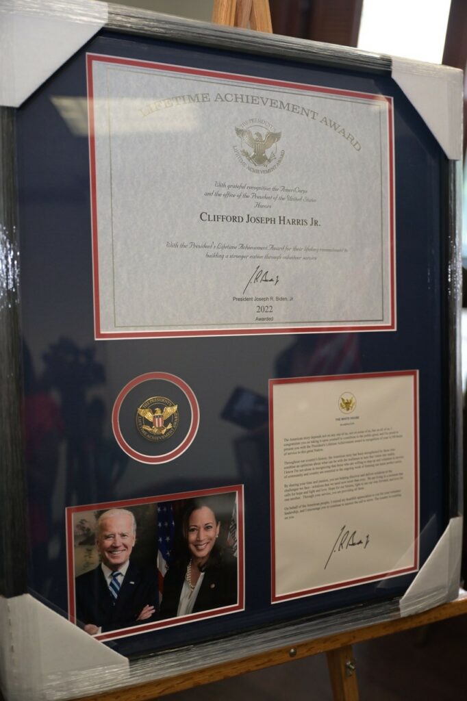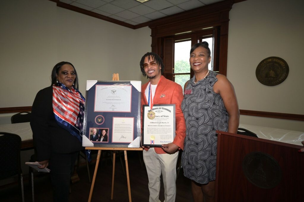 Afterwards, Ambassador Lenore Peterson of the Global International Alliance Program presented Mr. Harris BKA [better known as] T.I. with the Volunteers Lifetime Achievement Award from President Joe Biden. His wife Tameka Harris as well as his sons, Messiah and Domani, were in attendance. The presentation included congratulatory words from President Biden and a medal for Mr. Harris’ service.