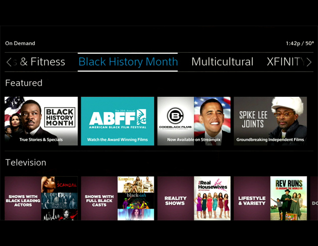 The new destination will be accessible to all Xfinity TV subscribers from the main menu of Xfinity On Demand, and will feature a range of TV collections highlighting shows with “Black Lead Actors and Full Cast,†“Reality Shows,†“Talk Shows & Clipsâ€; a variety of movie collections such as “Faith & Family,†“Comedies,â€Â “Documentaries†and “Films By Black Directorsâ€; plus music categories including “Hip-Hop,†“R&B Soul,†and “Reggae.†The Xfinity On Demand destination also offers quick and easy access to networks like BET and TV One. Throughout the month, Xfinity will also offer several other short-term collections of programming for Black History Month, including: