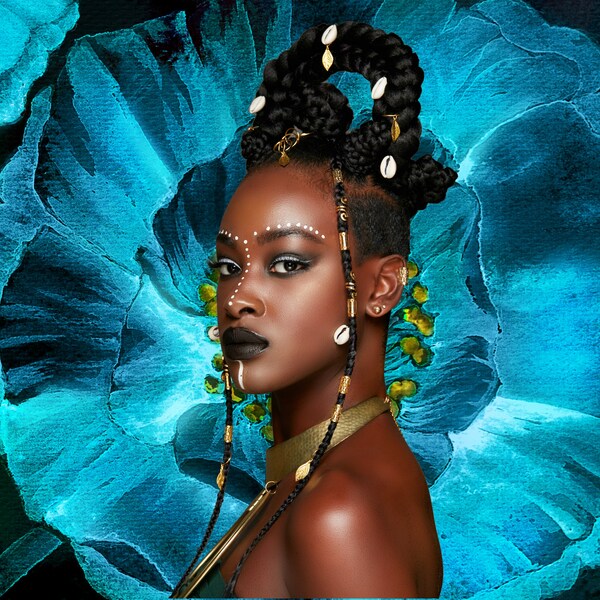 - EMPOWERED: A striking hairstyle featuring a braided Bantu knot crown supported by a buzz cut on both sides. Long face-framing braids hang elegantly, and cowrie shells and gold bands add the final touch.
