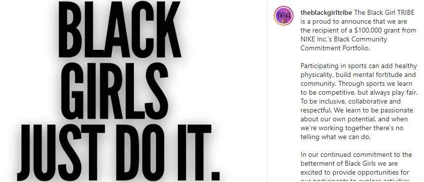 A Washington, D.C.-based nonprofit called The Black Girl Tribe announced that it has received a $100,000 grant from Nike’s Black Community Commitment Portfolio. According to an Instagram post, the grant from the sneaker giant will be used to expand the Black Girl Tribe’s programming, in addition to launching a “Black Girls Just Do” Initiative. Forthcoming activities will integrate sports and physical activity.