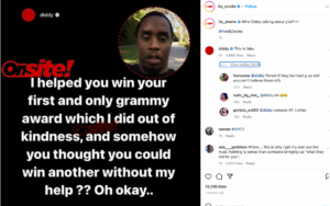 “I helped you win your first and only Grammy award which I did out kindness, and somehow you thought you could win another without my help ?? Oh okay..,” Diddy captioned the since-deleted post.