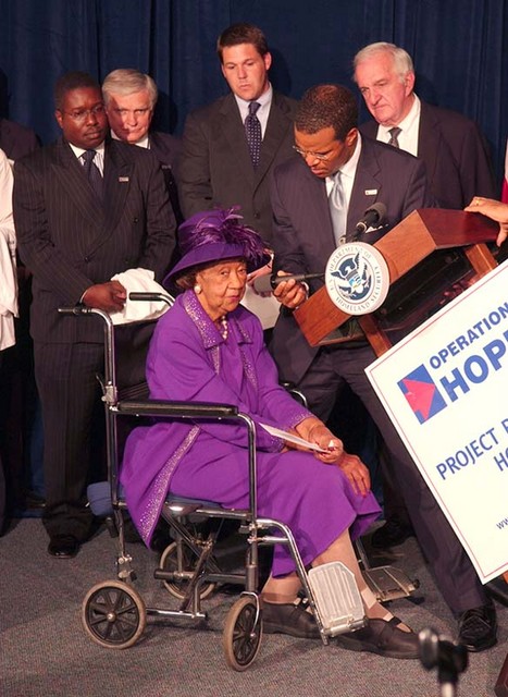For nearly half a century, Dorothy Irene Height has been a vocal champion and leader in the Civil Rights movement. As the only female member among the major leaders of the Civil Rights Movement—along with Martin Luther King, Whitney H. Young, A. Philip Randolph, James Farmer, Roy Wilkins and John Lewis—Height fought for equality and human rights for all people. Among her numerous accomplishments: Height was named to address issues of duress during the aftermath of the Harlem riot of 1935; appointed leader of the United Christian Youth Movement of North America in the New Deal era (1933); was on the staff of the National Board of the YWCA of the USA (1944 - 1977); elected president of the National Council of Negro Women (1957-1998); and received the NAACP Spingarn Medal, the Presidential Medal of Freedom from Bill Clinton, and the Congressional Gold Medal, the highest civilian and most distinguished award presented by the U.S. Congress. She was as well known for her extensive collection of hats, as well as for her indomitable spirit. (Image source: New York University) (Click here to view Women of Power Legacy Award Dorothy Height Tribute video.)