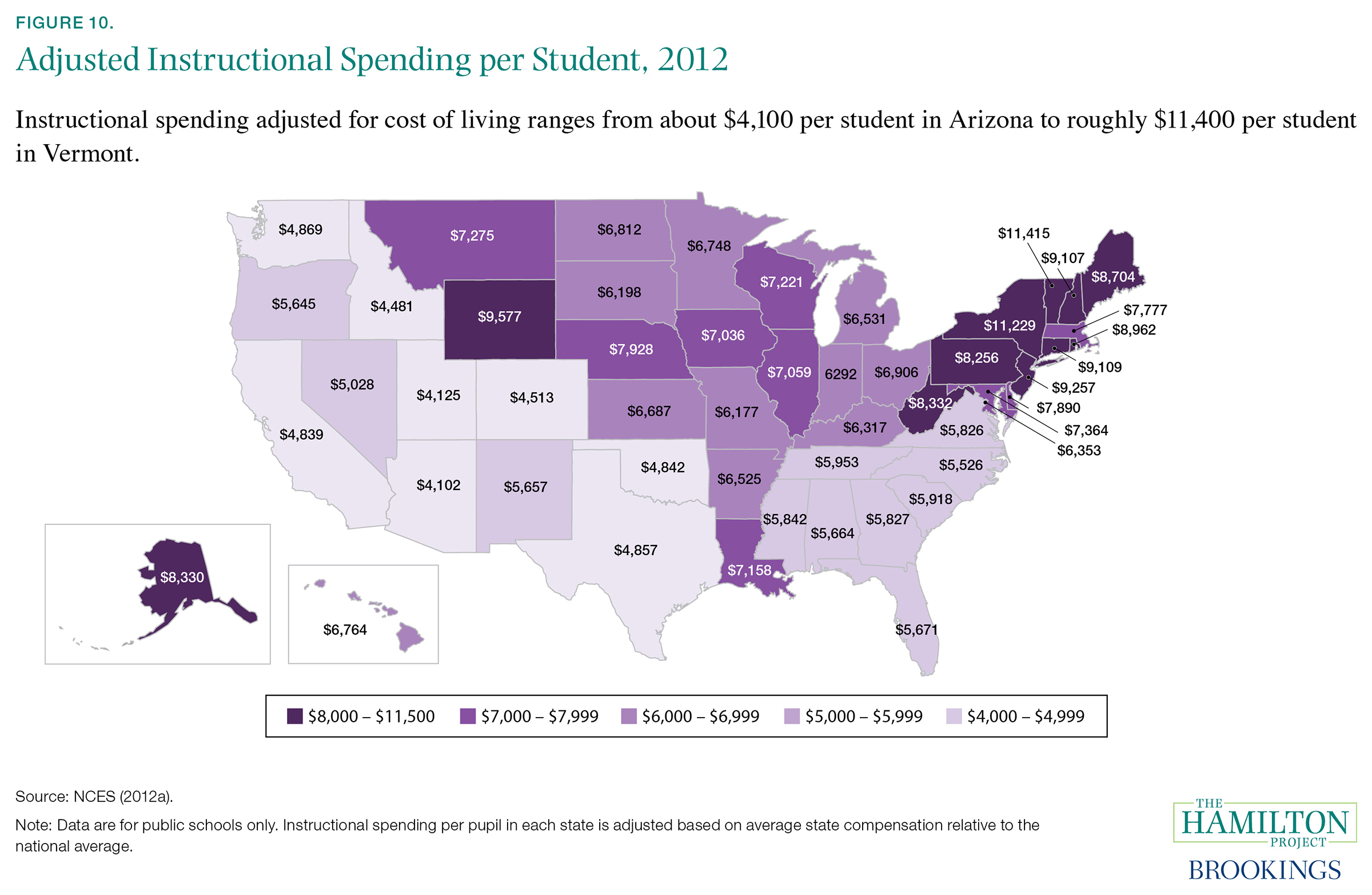 Instructional spending includes salaries and benefits for teachers, textbooks, supplies, and other purchased services for extra- and co-curricular activities. While schools in the Northeast spend $8,000 to $13,000 or more per student on instruction, schools in western and southern states typically spend much less.