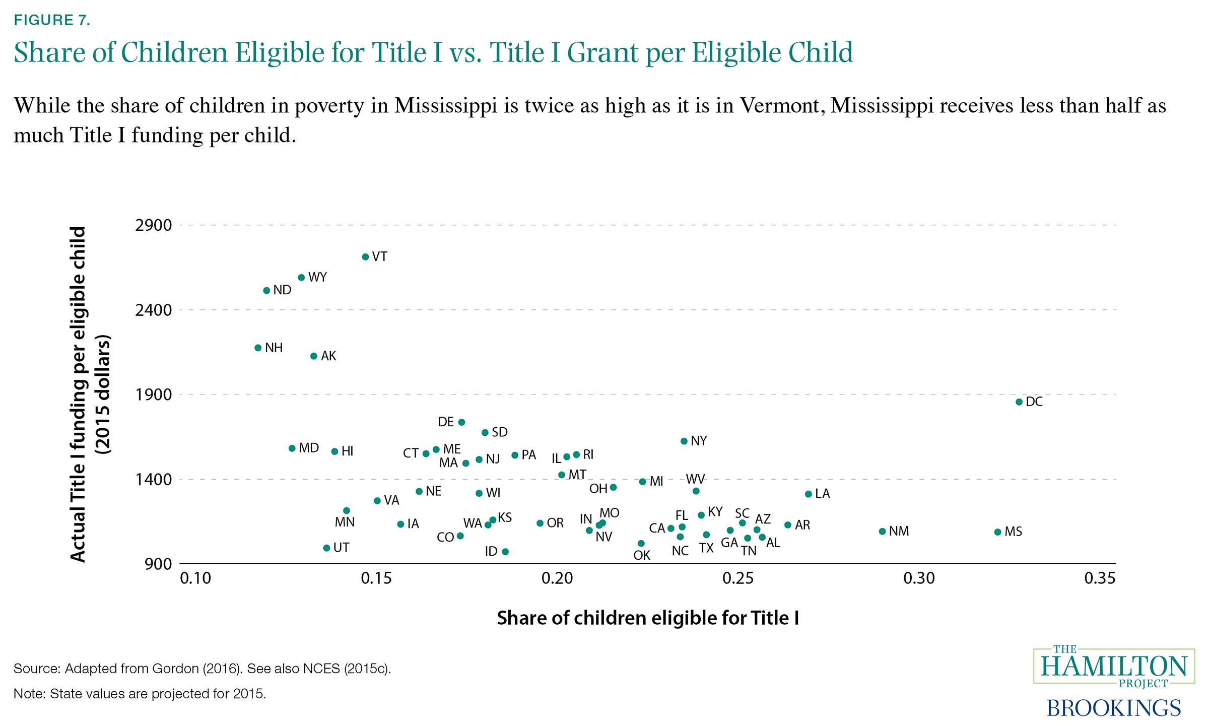 Gordon explains that a small state minimum leads to states such as Vermont receiving a disproportionate level of Title I funding. Additionally, a provision known as hold harmless, which allows districts to continue to receive allocations based on allocations received in previous years, prevents Title I funding from adapting quickly to structural changes in poverty levels across states and districts.