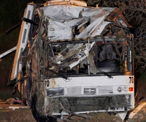 The vehicle struck a car, flipped and plowed into a pickup truck, authorities said. Jordi Garcia, a manager for InterBus Tours, said, “The information that we have is that the bus’ brakes failed and the accident occurred.”
