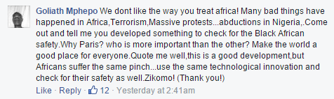 The post quickly received comments from many outraged that Facebook made the feature available for those in France and did not for prior terrorist attacks most of which occurred in the non-Western world.
