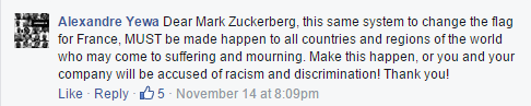 Many also criticized that fact that Facebook allowed users of its platform to overlay their profile pic with the flag of France and did not offer that capability when other countries lost citizens from terrorism.