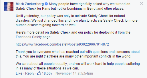 Facebook CEO Mark Zuckerberg responded to the criticism on his personal Facebook page. He wrote that many “rightfully†asked why Safety Check was turned on for France and not for attacks in Beirut or other places.