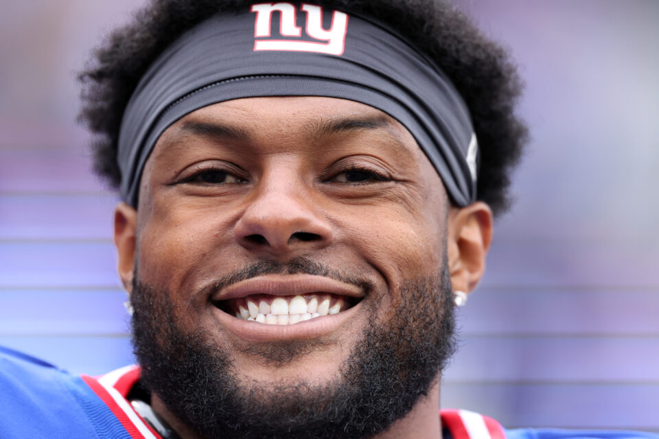 EAST RUTHERFORD, NEW JERSEY - OCTOBER 02: Kayvon Thibodeaux #5 of the New York Giants smiles during the first quarter of the game against the Chicago Bears at MetLife Stadium on October 02, 2022 in East Rutherford, New Jersey. (Photo by Al Bello/Getty Images)