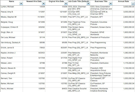 A corporate spreadsheet which contained the salaries of more than 6,000 Sony Picture employees, including the company’s top executives, has not been confirmed or denied by Sony. “The theft of Sony Pictures Entertainment content is a criminal matter, and we are working closely with law enforcement to address it,” a company spokesman told The Washington Post. On the spreadsheet, employees’ names, job titles, home addresses, bonus plans, and current salaries are all visible and documented.