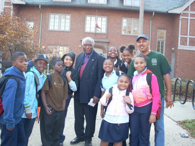 Local school children are also enthusiastic fans of their congressman, Rep. Danny Davis, pictured here with them at a district voting precinct.