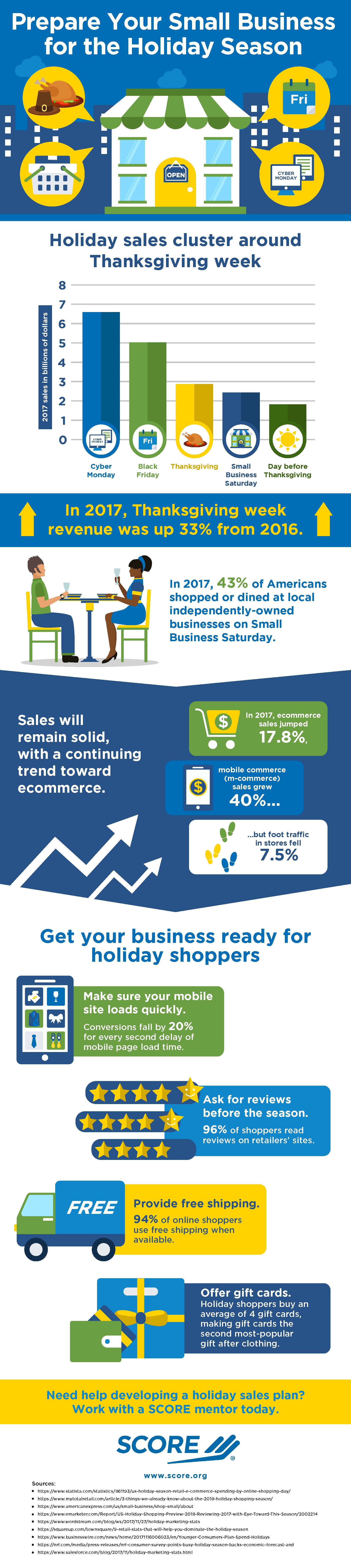 And SCORE, the nonprofit that helps and mentors U.S. small businesses, offered tips on how a business can get ready for the holidays. (See the infographic below.)