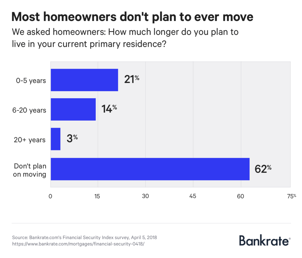 A new Bankrate.com report found that over 6 in 10 homeowners (62%) say they do not ever plan to move while the remainder anticipates that they’ll be staying in their current home for at least another five years.
