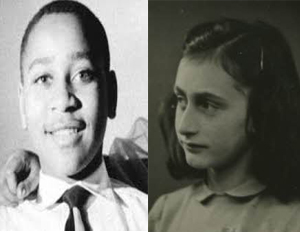 Cohen pairs  Anne, a then 15-year-old Jewish girl whose diary offered the world a gripping perspective of the Holocaust touching the hearts of humanity next to Emmett a 14-year-old African-American boy whose brutal murder in Mississippi sparked the modern civil rights movement side-by-side, in hope, that spectators young and old, black and white, are inspired and respond to her call to action.