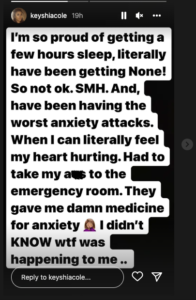 “I’m so proud of getting a few hours sleep, literally have been getting none! So not ok. SMH. And, have been having the worst anxiety attacks. When I can literally feel my heart hurting. Had to take my a** to the emergency room. They gave me d*mn medicine for anxiety. I didn’t KNOW wtf was happening to me..”