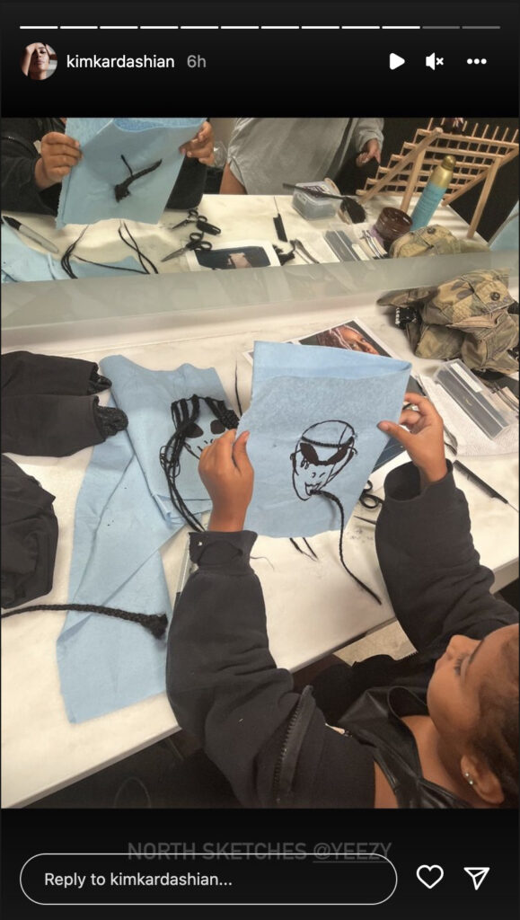 In one picture of the recent design studio visit, North admires her work — an alien-like figure drawn on light blue fabric, equipped with black shades and a braid sticking out like a tongue.