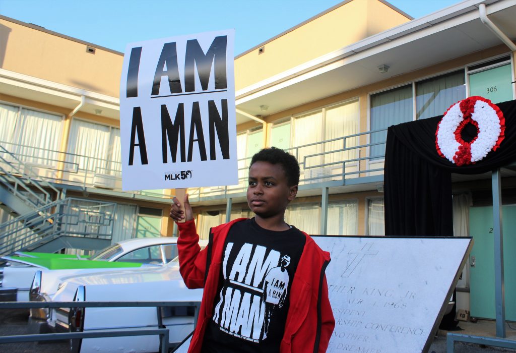 A young boy holds an “I Am A Man” sign in front of the Lorraine Motel (Black Enterprise)