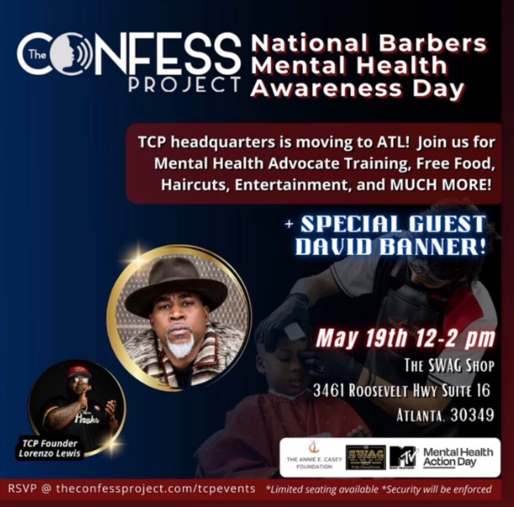 The Confess Project (TCP), a movement committed to training black barbers to be mental health advocates, partners with Killer Mike’s The Swag Shop during Mental Health Awareness Month to instruct barbers on navigating conversations with clients about mental health on May 19 from 12:00 p.m. to 2:00 p.m.