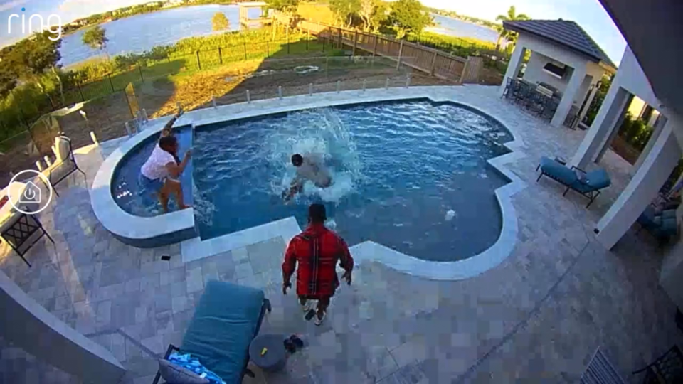 While other adults were around, Drummond can be seen racing to the pool to jump in and save his son.