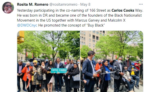 The northeast corner of West 166th Street and Broadway in New York was co-named Carlos Cooks Way on May 7, 2021, to honor the legacy of Black Nationalist Carlos Cooks, according to The Black Star News.