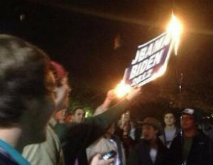 Some students burned an Obama-Biden sign during the unrest, and two students were arrested.