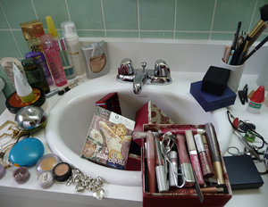 For instance, placing all your cosmetics in a decorative box under your bathroom cabinet may be tidy, but it’s neither functional nor sustainable. Since you use these items frequently, they will likely end up strewn about drawers and countertops more often than tucked behind cabinet doors. Instead, organize your makeup by type within the top drawer of your vanity for easy access. Use shallow square and rectangular trays from the dollar store, and place Velcro tabs on the bottom of each tray to adhere them to the drawer. No more rolling items every time you open the drawer.