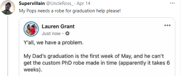 A flood of comments poured in about Grant’s inspirational testimony. When Grant’s son also announced his father needed a graduation robe, Twitter users responded again. The issue was resolved.