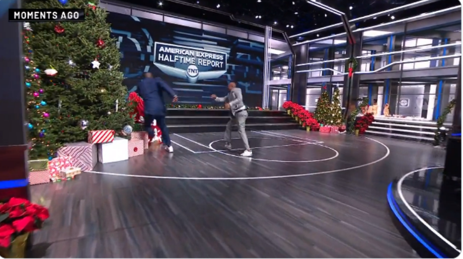 Shaquille O’Neal and Kenny Smith were having so much fun while filming Inside The NBA on Tuesday night that Shaq ended up tumbling face-first into a gigantic Christmas tree.