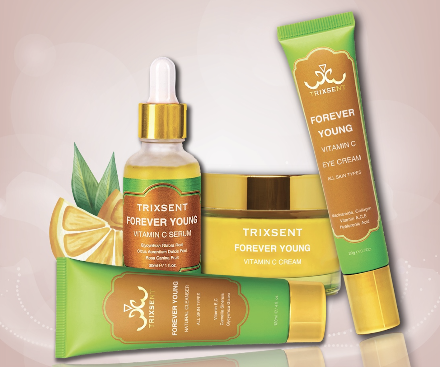 What to get? Forever Young Collection ($200.00 CAD). The bundle includes a vitamin C cleanser, vitamin C serum , vitamin C eye cream, and vitamin C cream.