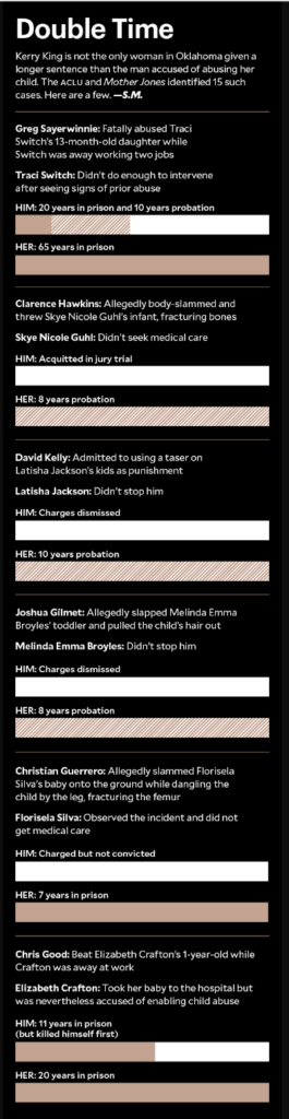 While the language of these laws refers to parents, prosecutors overwhelmingly target mothers, not fathers. Since 2009, at least 90 percent of the people incarcerated for the offense in Oklahoma were women. Attorneys in multiple states who specialize in this area of law tell me they have never seen a man prosecuted for failing to stop someone else’s violence against a child; Mother Jones found relatively few examples.