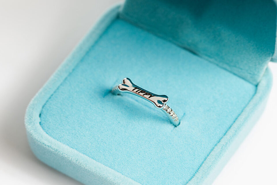 The rings and necklaces are made from high-quality sterling silver. Five stones line the top parts of the outer band. A bone that displays the name of your pet rests at the top of the ring. The bone is engraved in the United States. The same applies to rings for cats. Instead of bone, an oval with a pair of cat ears rest atop the ring. Your cat’s name can be engraved on the oval.