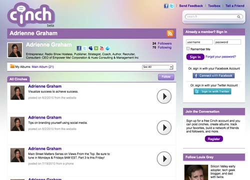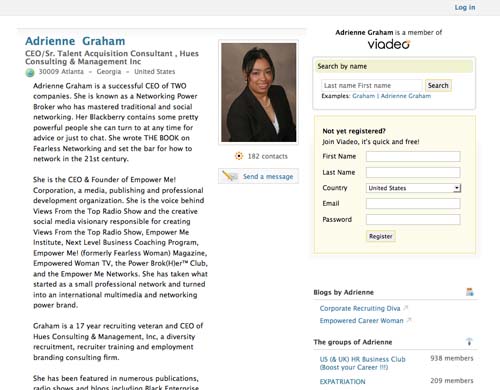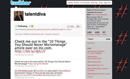 This week's Social Media Connection is Adrienne Graham, founder and CEO of Empower Me! Corporation, a media, publishing and professional development company. She is the voice behind Views From the Top Radio Show and the creator of Empower Me! Networks, Empower Me Institute, Empower Me! (formerly Fearless Woman) magazine, Next Level Business Coaching Program, Empowered Woman TV, the Power Brok(H)er™ Club, and Empower Me! Radio. A 17-year recruiting veteran, Graham is also CEO of Hues Consulting & Management, Inc., a diversity recruitment, recruiter training and employment branding consulting firm. She is also author of the book Go Ahead, Talk to Strangers, The Modern Girl’s Guide to Fearless Networking, as well as two blogs: Corporate Recruiting Diva and Empowered Career Woman. In her own words, Graham (shown here with her "junior partner" Jose) shares how she uses social media to achieve her goals.